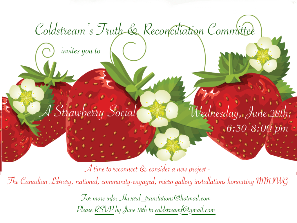 About 20 participants enjoyed strawberries and fellowship as they learned about the Canadian library project. Next steps are being initiated and there was interest for membership in Coldstream’s Truth and Reconciliation Committee from several participants who we are happy to have join us. There is still room for others. Contact coldstream.clerk@gmail.com if you would like more information.