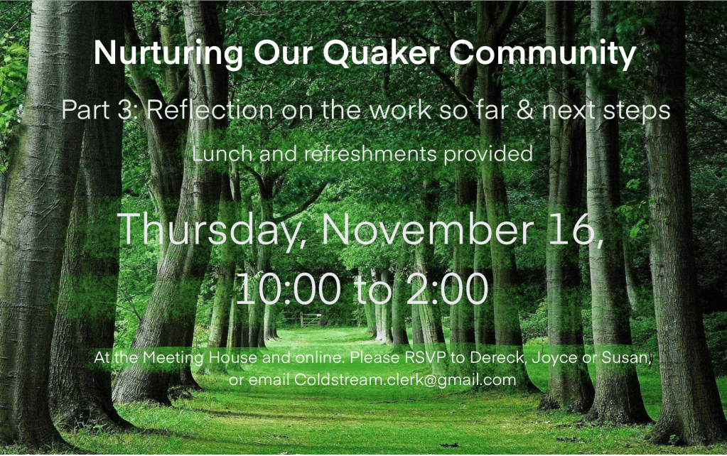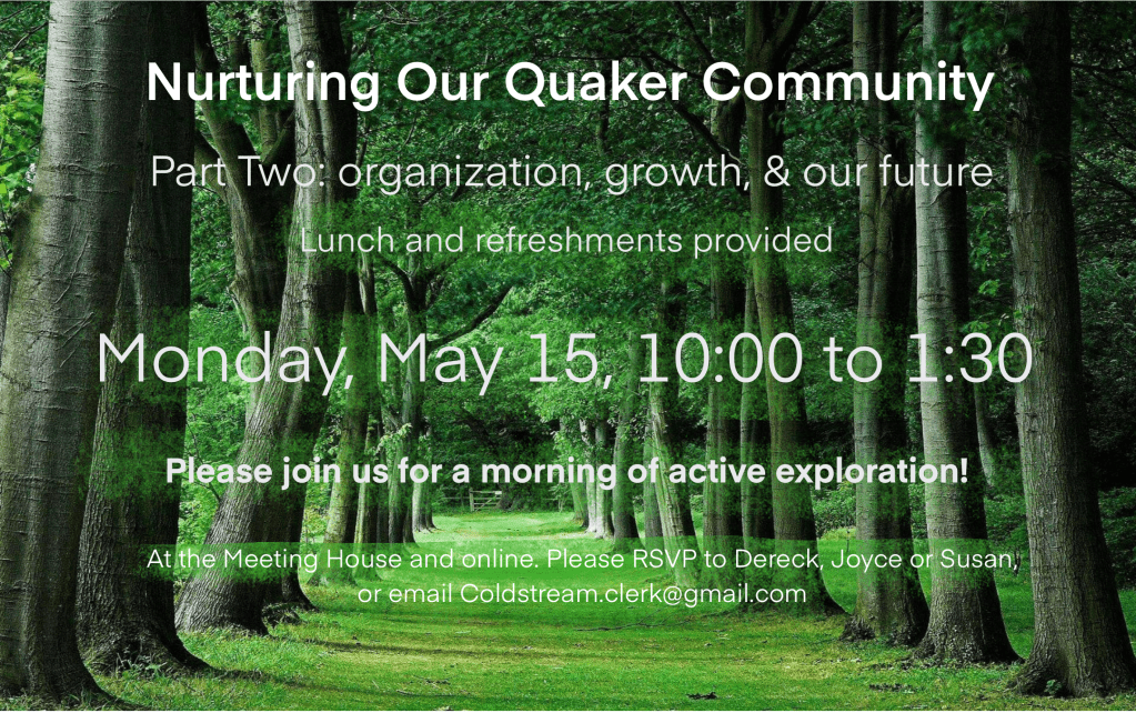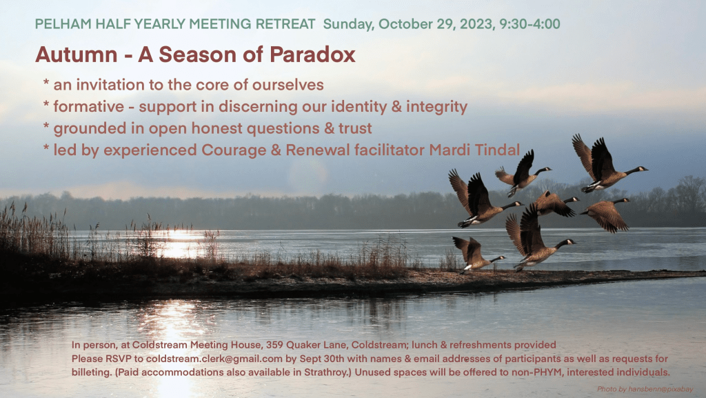Coldstream Monthly Meeting became interested in this retreat topic after viewing a lecture by Parker Palmer in which he suggests that this type of retreat may be an avenue to inform and make connections with those who don’t know a lot about the Society of Friends or our values and aspirations.