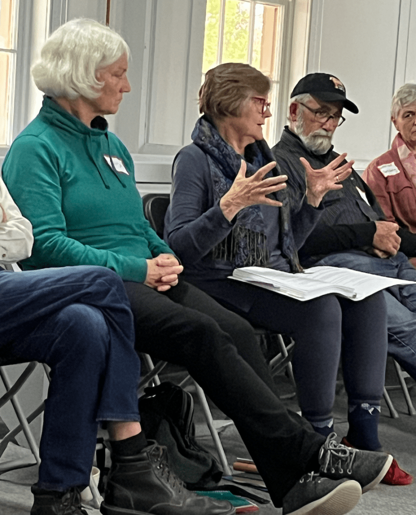 Mardi gave us some background on the Circle of Trust approach which is secular but rooted in Quaker practices. Then under her guidance we read poems aloud within the whole group to fuel self-reflection whether through journalling or walking about. We practiced deep listening in small groups. Then we learned about open, honest questions which many found harder to create than might be expected, and finally we listened to one another in small groups once again using this type of question to help each person reflect more deeply.